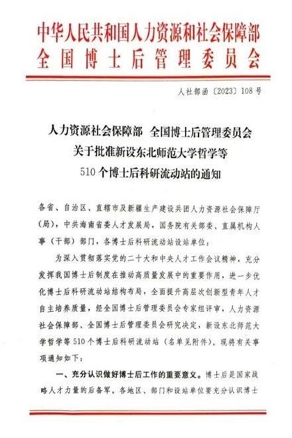 近日,人力资源和社会保障部、全国博士后管理委员会联合下发《关于批准新设东北师范大学哲学等510个博士后科研流动站的通知》(人社部函〔2023〕108号),我院获批新设数学博士后科研流动站。这是我院继获得数学学科博士学位授予权后,学科发展的又一个标...