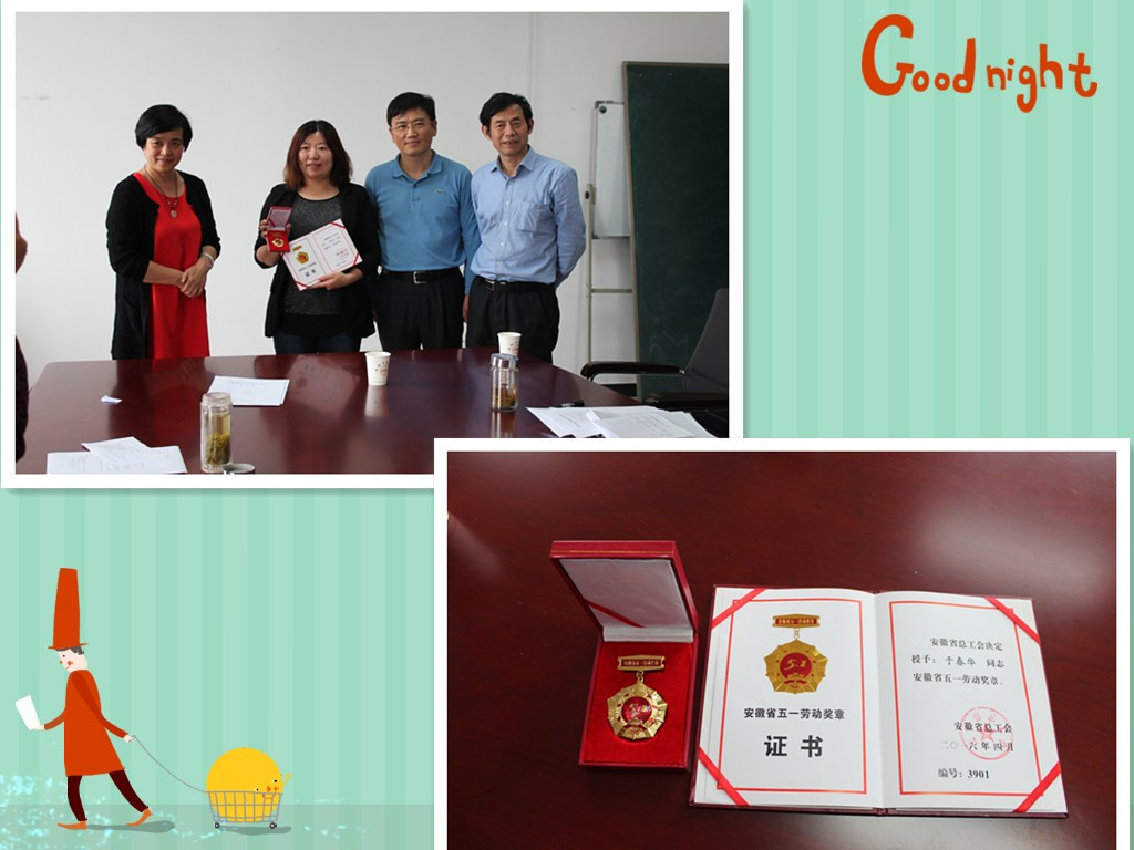 5月24日下午,校工会主席赵恩秀、教务部部长陈翌庆来到我院,热烈祝贺我院青年教师于春华同志获得安徽省“五一”劳动奖章,并为于春华同志颁发奖状和奖章。 会上,校工会赵主席说,于春华自参加学院、学校、安徽省青...