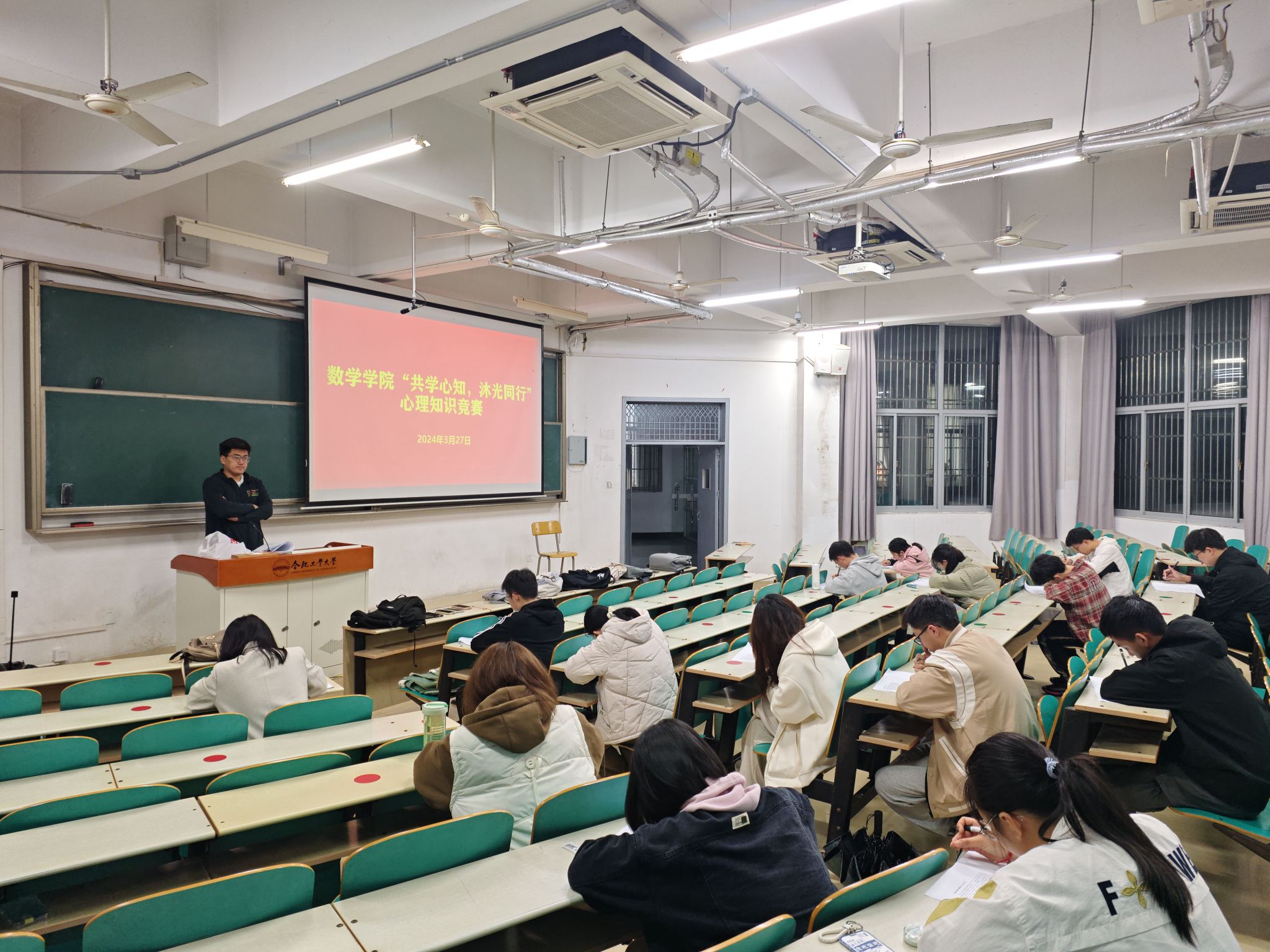 为普及大学生心理健康知识,提高学生心理健康水平,培养自尊自信、阳光向上的积极心态,南宫体育于3月27日晚在翠九教101教室,举办了“共学心知、沐光同行”心理知识竞赛。