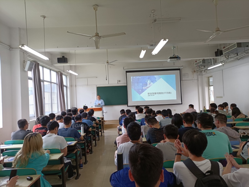 5月14日下午,南宫体育“数梦蓝图”就业指导讲座在翡翠湖校区举行。平安产险安徽分公司人事经理孔凡荣和DXCtechnology 产品研发部于鹏来校与学院2018级本科生交流。