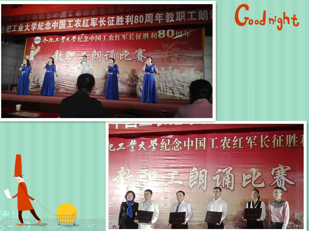 为隆重纪念中国工农红军长征胜利80周年,传承长征精神,凝聚民族力量,弘扬中华民族艰苦奋斗的优良传统,激发我校教职员工的民族自豪感和责任感,践行社会主义核心价值观,学校党委宣传部、校工会联合举办了教职工朗诵比赛。我院高度重视,积极组织,挑选了由钱泽平、刘桂庆、于莉、熊莲花、段传庆五位老师组织的代表队,在比赛中合诵了诗歌名篇《人民万岁》,经过9月28日预赛(淘汰赛)和10月12日决赛,最终取得了二等奖的好成绩!