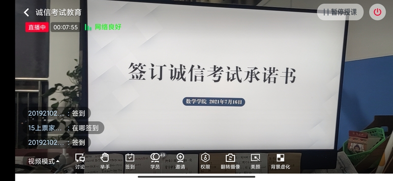 7月16日,为进一步严肃考风考纪,增强当代大学生的诚信意识和责任意识,营造风清气正的考试风气,在考试周期间,南宫体育举行“明礼诚信 正风考纪”考试诚信教育线上宣讲活动,本次宣讲由韩玉洁老师主持,共有四百余位同学参与并签订了诚信考试承诺书。