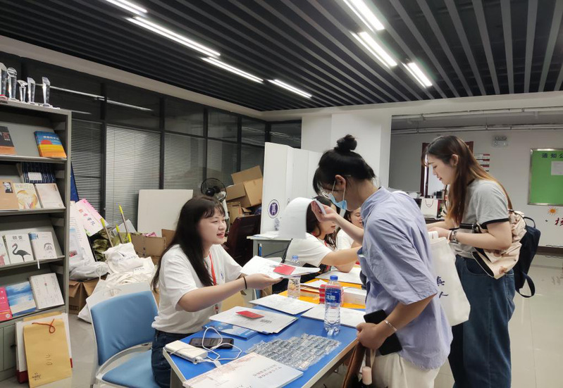 上午七点,志愿者穿着统一服装在清凉的晨风中到达集合地点。男生志愿者在一食堂前的广场上搭起帐篷,准备签到表和小推车;女生志愿者在科教楼B座16楼大厅搭好桌子,准备新生报道材料和物资。随着新生的陆续到来,志愿者们井然有序地忙碌起来,核对新生信息,帮助新生搬运行李;分发《研究生手册》、校园卡、防疫爱心包等入学材料与防疫物资。新生纷纷表示,南宫体育的迎新工作充满爱心、让人舒心,十分暖心!
