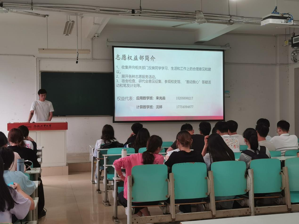 会议第二项,陈鹏同学从活动组织、活动对象、活动意义三个方面,对“数动我心”朋辈帮扶系列活动进行了介绍,鼓励大家可以充分发挥自己的专业特长,面向全校本科学生就数学学科学业方面答疑解惑。同学们表现出极大的热情,纷纷报名参与活动,争取贡献自己的一份力量。